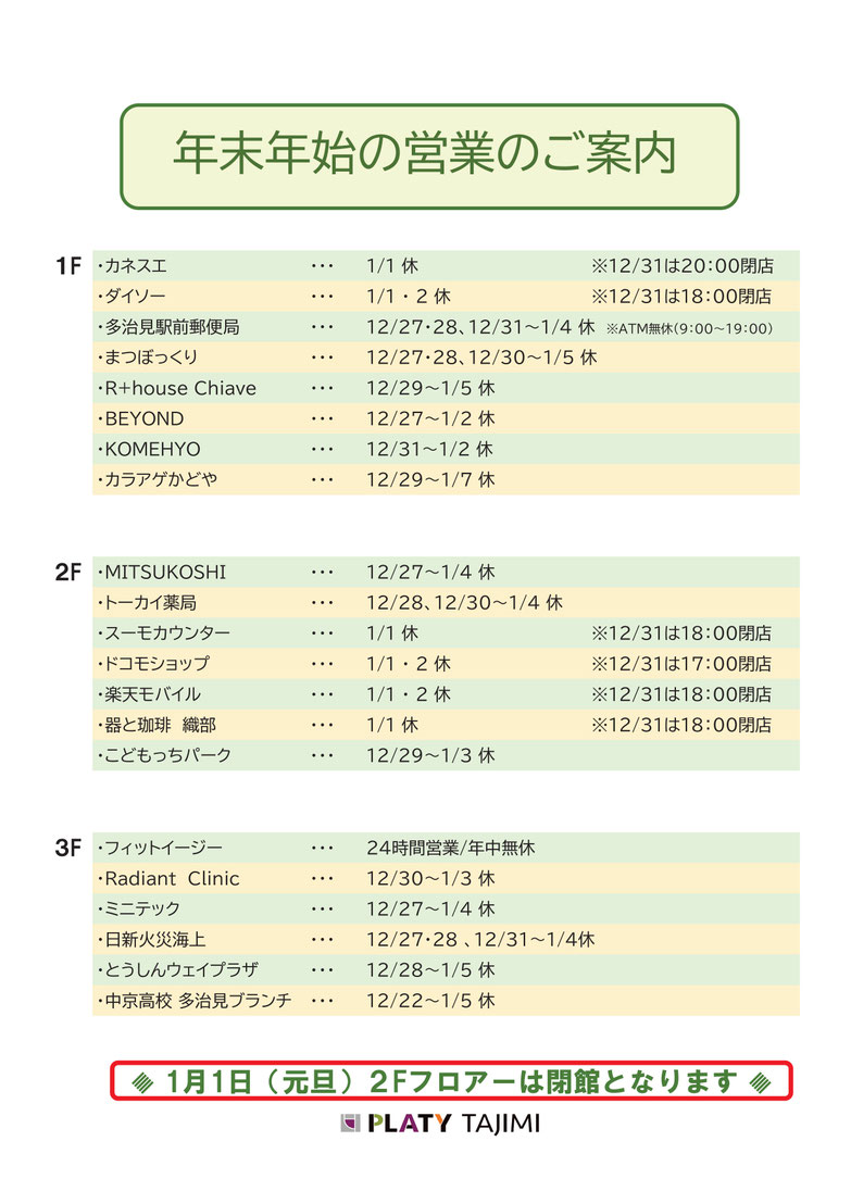 2025年~2026年 プラティ多治見 年末年始の営業のご案内